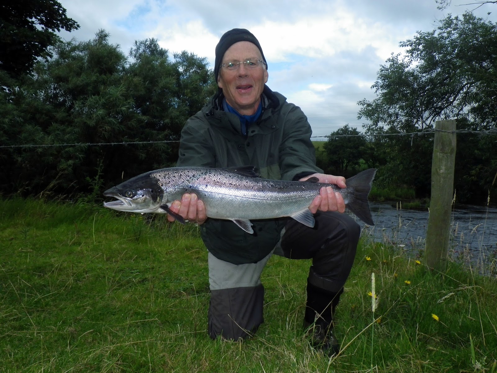 Upon returning to the Eden again, with the water falling following the recent rain, I was out with two regulars, John and Christian, and as usual they didn't let me down, as Christian, first of all landed a nice sea trout, (pictured left) and then proceeded to hook into a salmon (Grilse) of around 5lb, (pictured below) which he also landed. Had it not been for the heavy downpour through the previous night, which saw the river rising very slowly throughout the day whilst they were fishing, (not ideal) I think we would have seen further success. However I am certainly not complaining as they still caught fish.